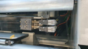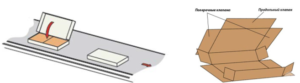 Коробка фиксируется специальными прижимами, затем происходит заклеивание двух клапанов коробки (переднего поперечного и продольного).